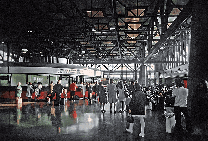 The new Ottawa railway station was built using glass and concrete, resembling an airport hangar in its architectural style. The interior was designed in a black-and-cream color scheme with slight pink accents. The station boasted an exceptional communication system, making train announcements audible from any part of the building—a stark contrast to the limited communication system at the 19th-century Union Station.