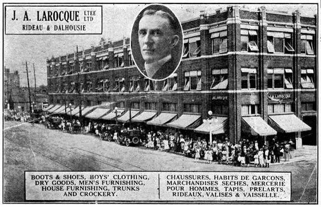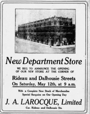 In 1933, the original owner of Larocque, Alphonse Larocque, decided to try his luck again. He opened another department store, J.A. Larocque, on the same Dalhousie Street, not far from Larocque Registered.
